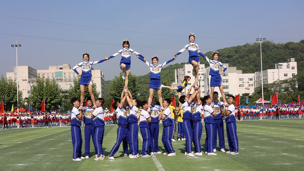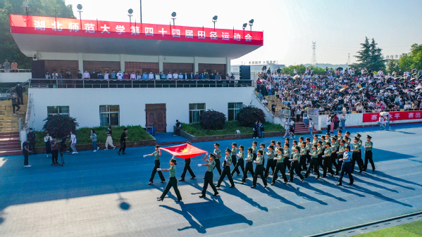 由16支学院代表队和教职工代表队组成的千人广播体操拉开了开幕式大型演出序幕,整齐化一、矫健有力的动作在富有时代气息的旋律中唤起了永不褪色的青春记忆;时而身形蓄势、气场待发,时而脚步连转、力蕴其中,时而身形腾起、劲如旋风的校园啦啦操表演在耀眼的舞动中洋溢着绚烂的青春底色;旋转环绕、舞步摇曳、音符躁动、裙摆飞扬的拉丁舞,在忘我的韵律中演绎着别样的花样年华。各种独具特色的文艺表演点燃了整个田径场。表演结束后,各运动项目有序开展,运动员们昂扬拼搏纵横田径赛场,用敢于争先的精神展现了湖师学子的朝气蓬勃。