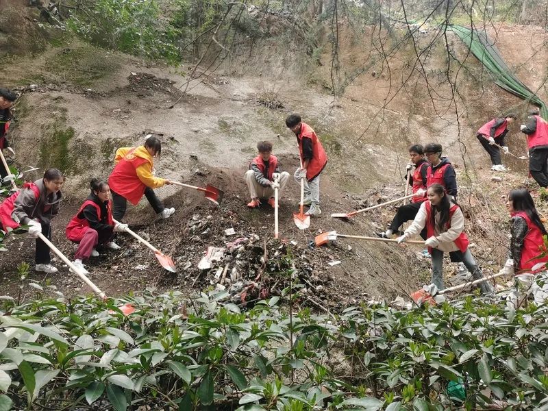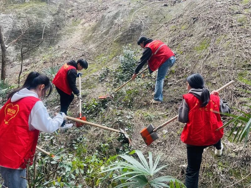 当天,32名湖师大志愿者,身穿“红马甲”,在社区工作人员的带领下,来到了半山腰,用铁锹将被杂草缠住的垃圾斩断,然后顺着山坡往下清理。志愿者干劲十足,认真清理,有的同学戴着的手套被杂草划破,仍继续坚持着干。